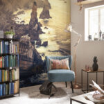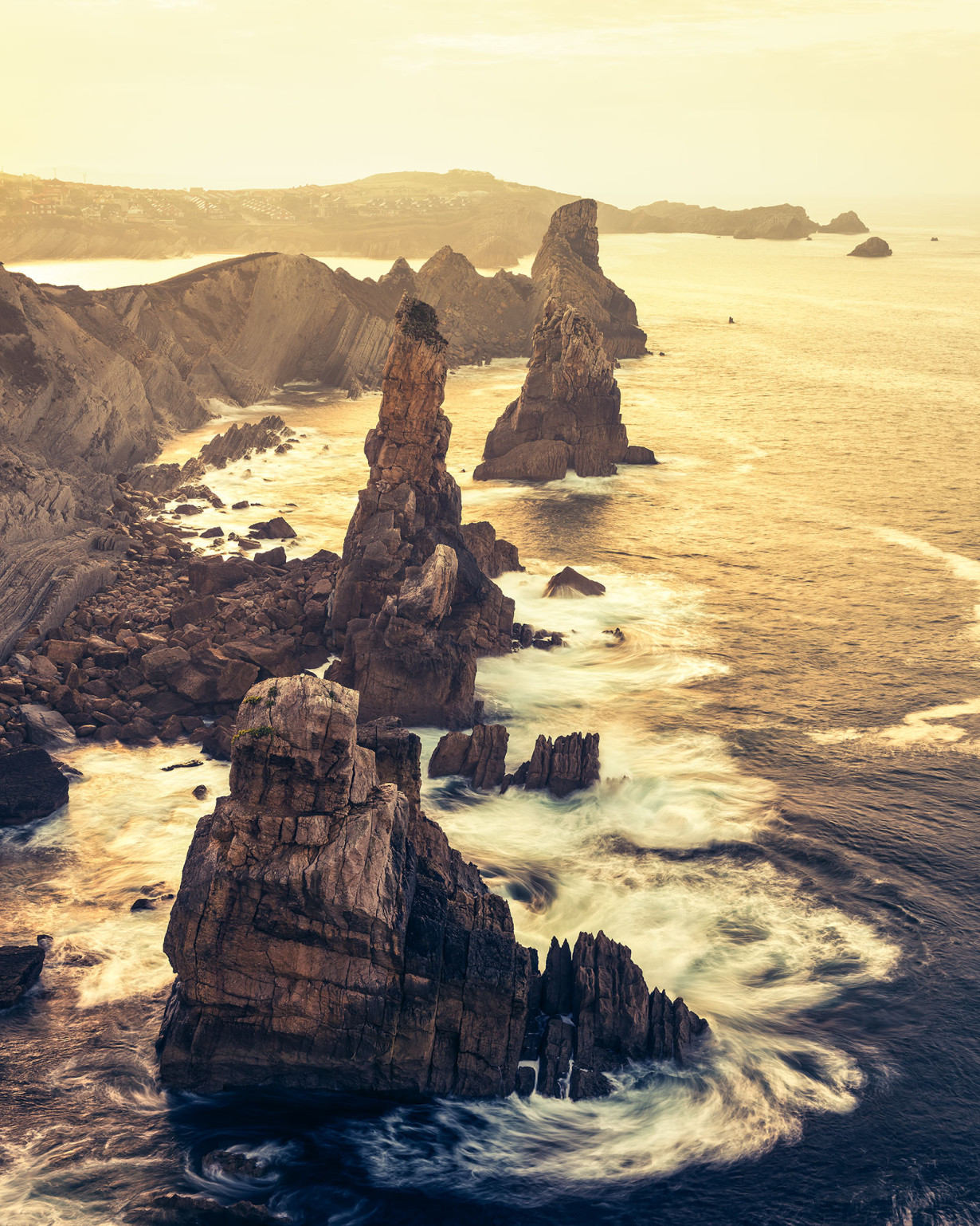 Премиум флиз фототапет Край бреговете на Северна Испания – сурови, скалисти върхове и разбиващи се вълни в златната слънчева светлина.