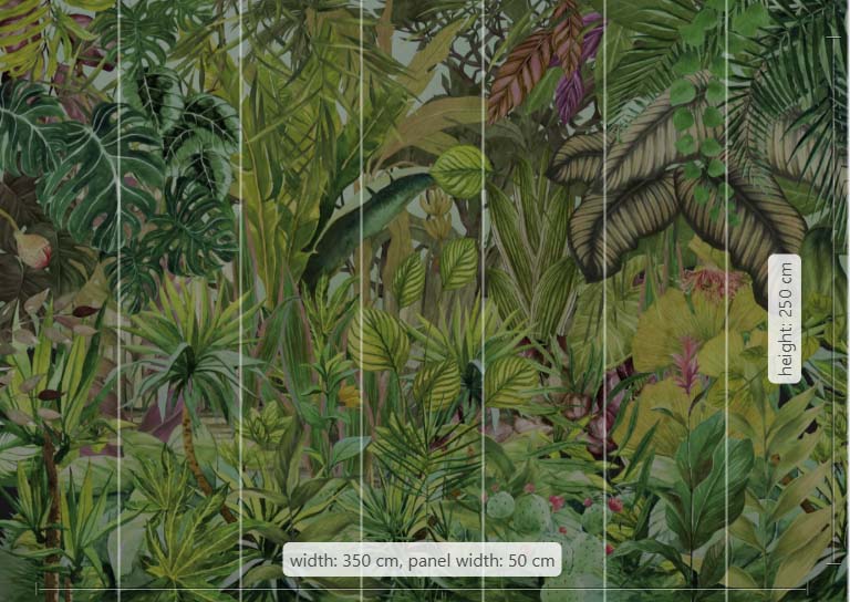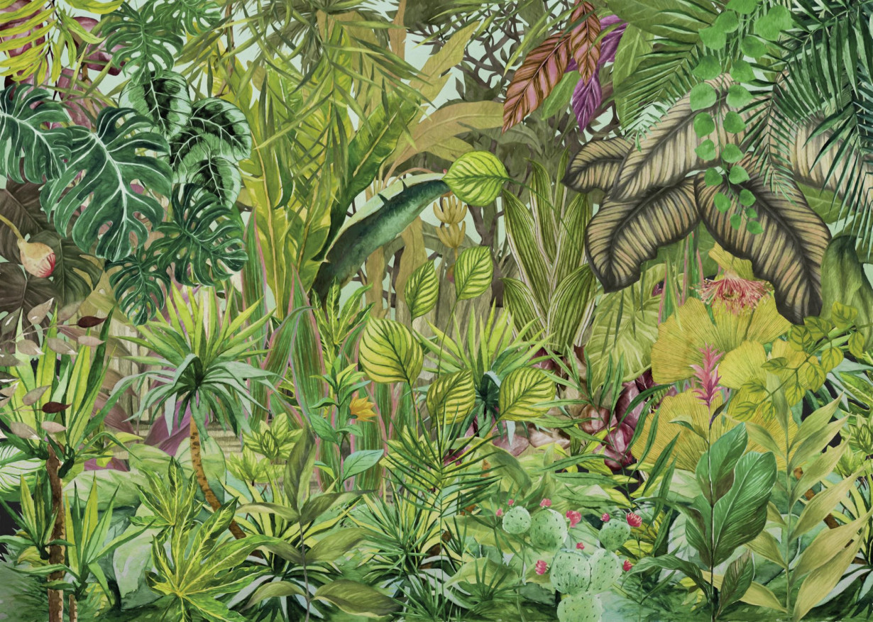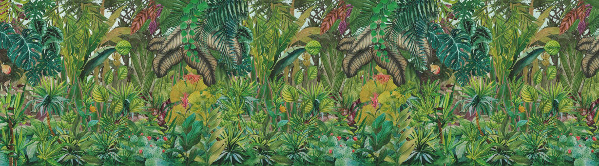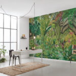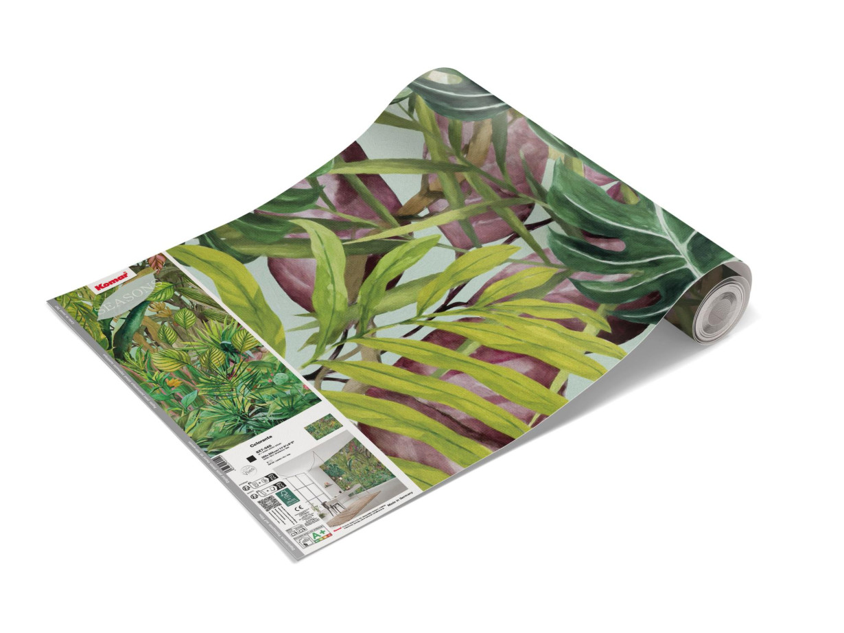 Големият мотив с палмово дърво разкрива своите цветове. Наситени зелени тонове и модерно бургундско червено се разпростират по стените и внасят екзотика в помещенията. Този тапет е идеален за придаване на личен почерк на обстановката.