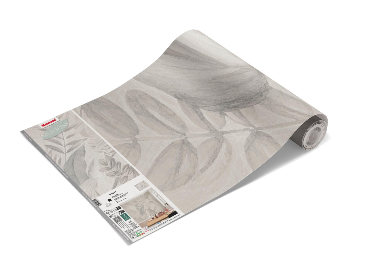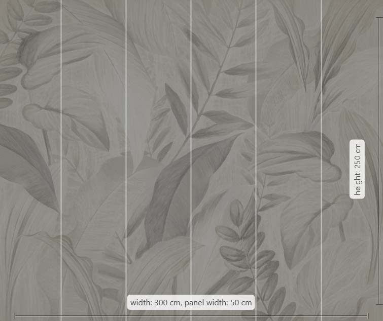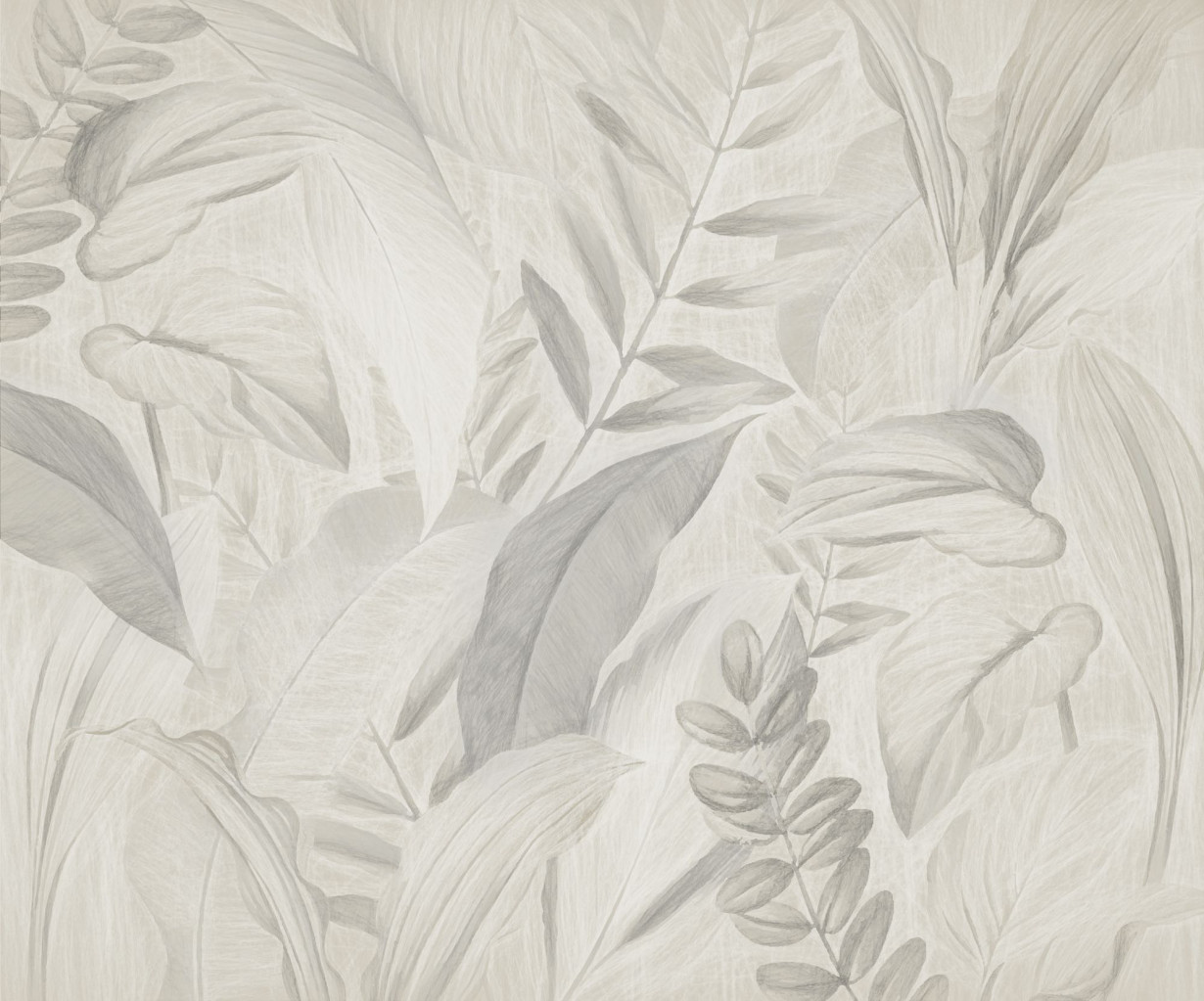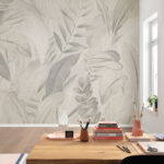 Меки нюанси на сиво-бежово, фини щриховки и деликатни листни структури се разгръщат по стената, придавайки на помещението нежна елегантност. Сдържаната илюстрация се вписва хармонично в обстановката, без да отвлича вниманието. Въпреки това дизайнът остава стилен акцент, който внася нотка изискано изтънчено излъчване във всеки интериор.