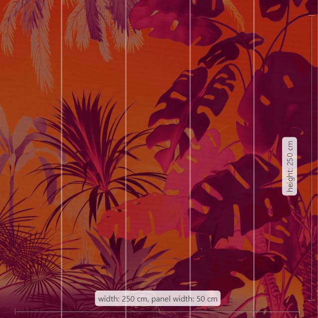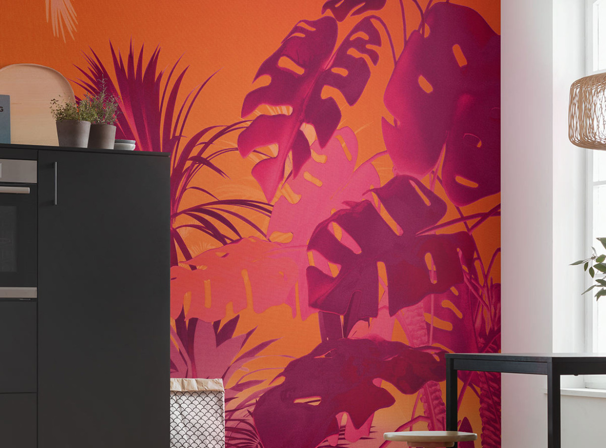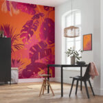 Тази фототапетна декорация впечатлява с дръзкия си и екстравагантен дизайн. Ярко оранжев фон, изпъстрен с едри розови тропически растения, създава уникална и въздействаща визия. Интензивните цветове напомнят на неонови светлини и придават силно присъствие на пространството, превръщайки го в акцент, който моментално привлича вниманието.