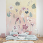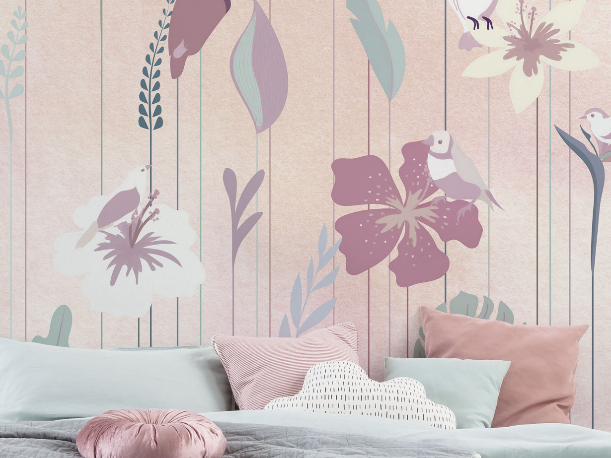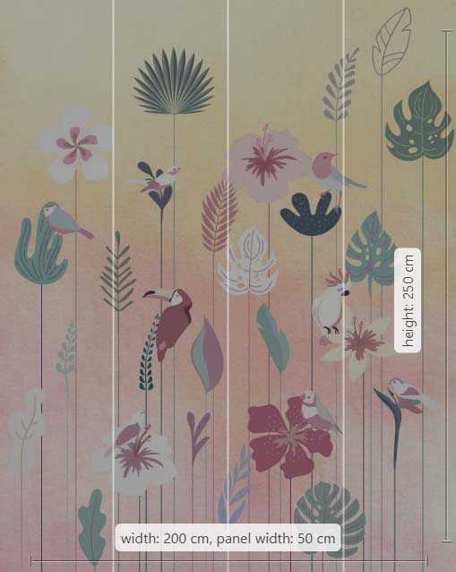 Папагалите, накацали върху малките цветчета, изглежда наистина се наслаждават. Със своята дъговидна цветова палитра този фототапет успява да внесе усещане за рай в помещението и да създаде позитивно настроение навсякъде около себе си.